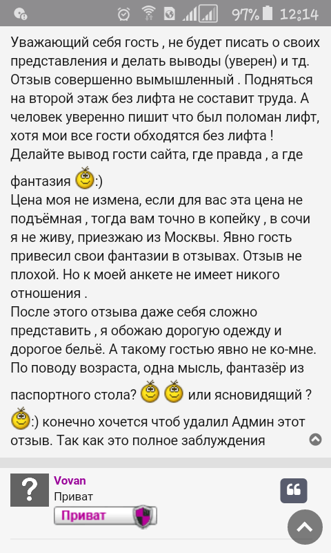 Да вы заврались мадам и с головой явные проблемы начались,наверное сказывается длительный стаж работы в данной сфере и нервоз от нехватки клиентов это мне вас жальViP писал(а): 2019-07-29 10:07 Фото мои. Очень не хочется чтоб так сильно обсуждали по этому номеру тел