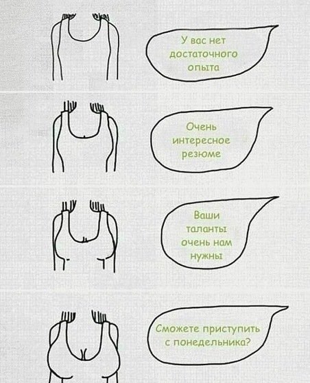 директор компании-партнера рассказывал недавно...)) пришел на новое место, изучает штатное расписание и видит у секретаря и водителя (обе молодые женщины) оклады по 40-50 тыр. вызывает их, объясняет, что ему придется понизить их зп поскольку на этих должностях столько получать не положено. далее диалог типа "вы не можете понизить нам зп без оснований, тогда вы и обязанности наши должны сократить" - "конечно, я это понимаю. с директором теперь можно не ебаться.")