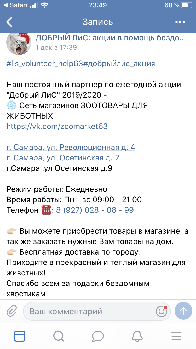 Дорогие форумчане! Поступила информация об акции добра от волонтёров ЛиС, смысл акции такой, приезжаете в указанный зоомагазин, ветклинику или другую организацию, которая участвует в акции и кладёте в «короб добра» корм для животных или другие вещи необходимые животным. В некоторых точках добра, допустим если это зоомагазин, можно купить корма на месте. Так же если у вас есть организация (магазин или ещё что-то) вы можете обсудить с работниками ЛиСа и они включат вас в акцию, привезут «короб добра» и объявление. Остальная информация по ссылкам в вк. Для тех , кто не пользуется вк прикрепляю принтскрин с контактами одной из организаций, участвующей в акции.
